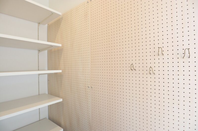 玄関土間に有孔ボードを設け、フックで物が引っかけられるようにしました!