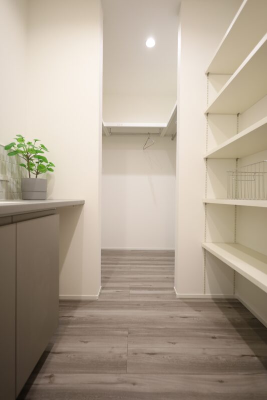 そして洗面スペースの奥にはファミリークローゼットがございまして、帰宅後すぐに上着をかけて、手を洗うことができます!