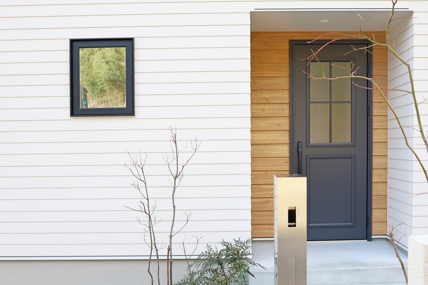 - 玄関部分で自然素材ので柔らかい印象の白の外観