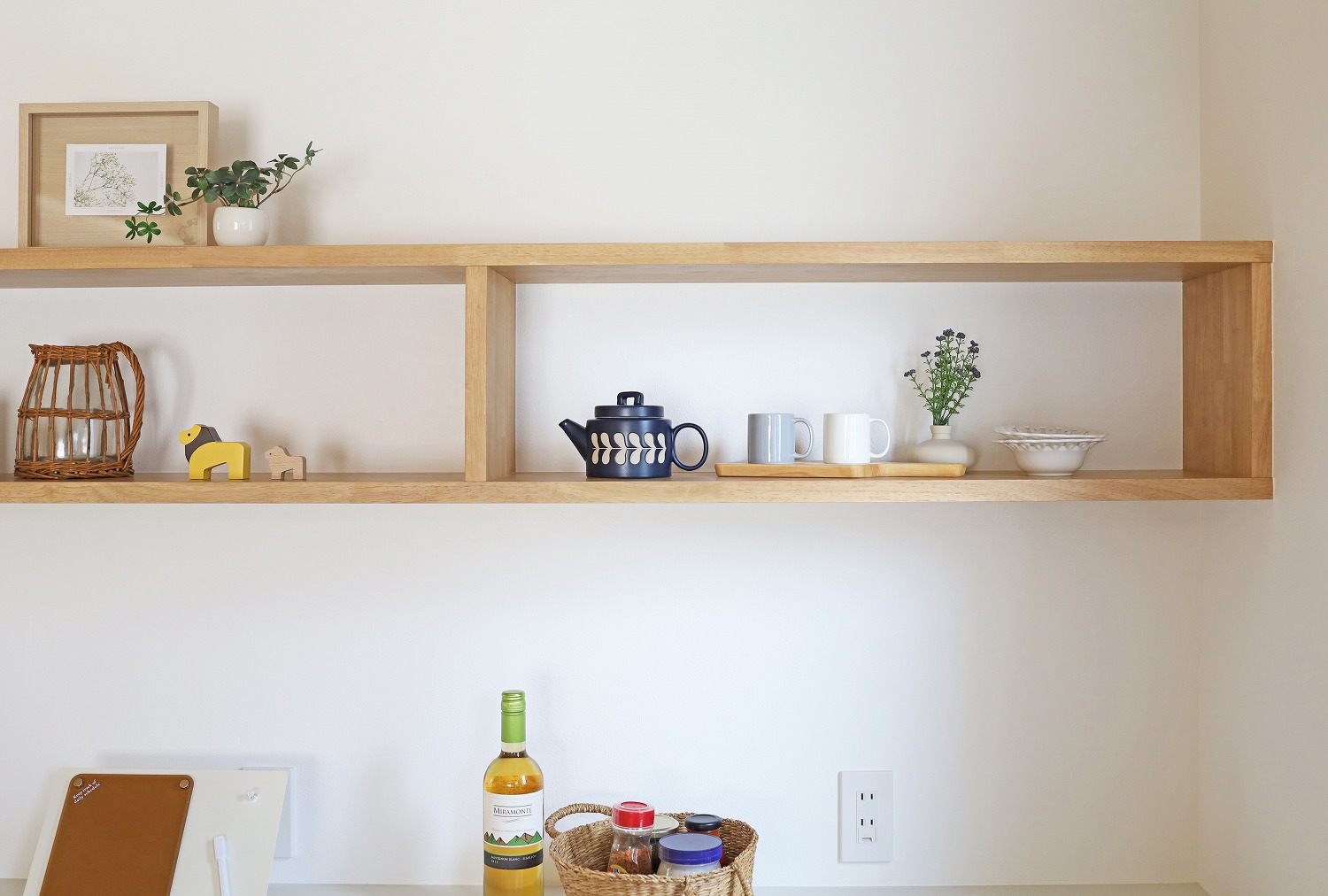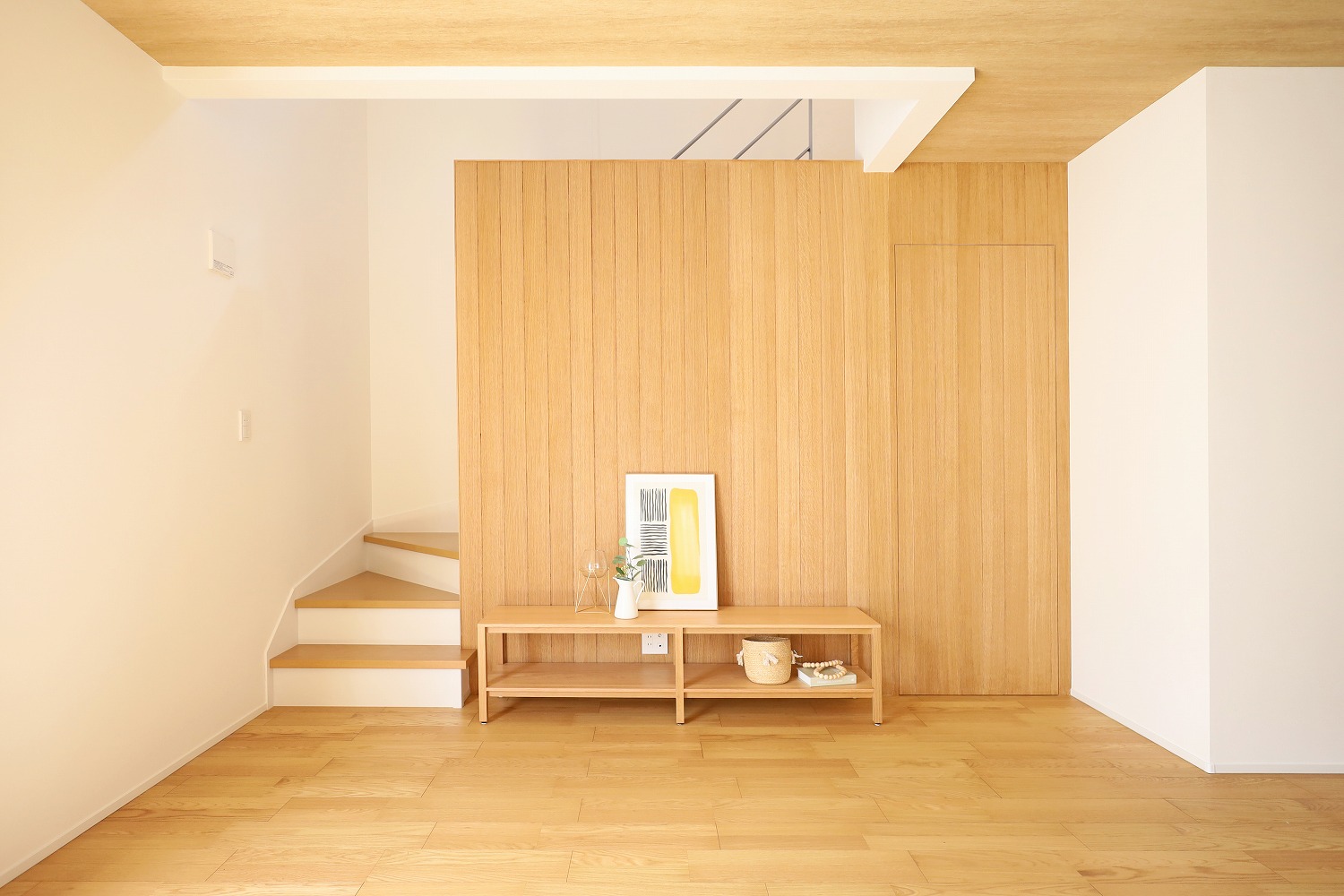 - 収納も兼ねる無垢材化粧壁がLDKのアクセント
